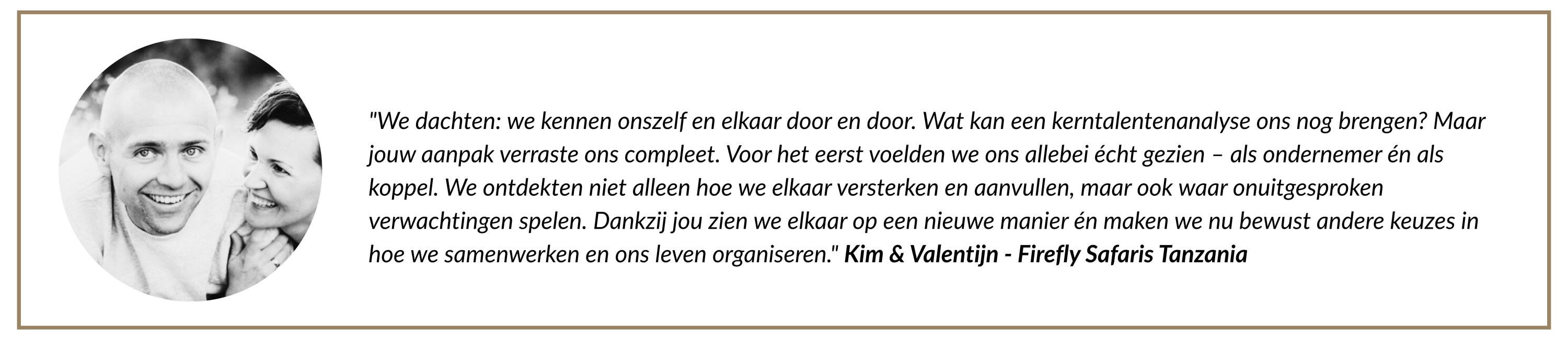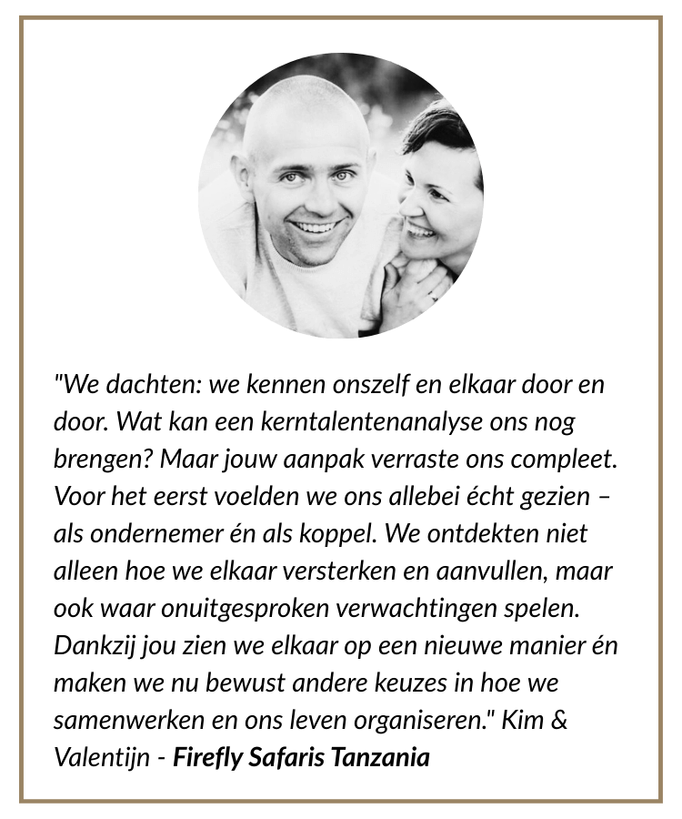 Resultaat: meer rust in gesprekken, minder ruis op de lijn en beslissingen die niet alleen het bedrijf dienen, maar ook jullie relatie versterken. Zodat jullie opnieuw mét elkaar leven en niet langer naast elkaar.